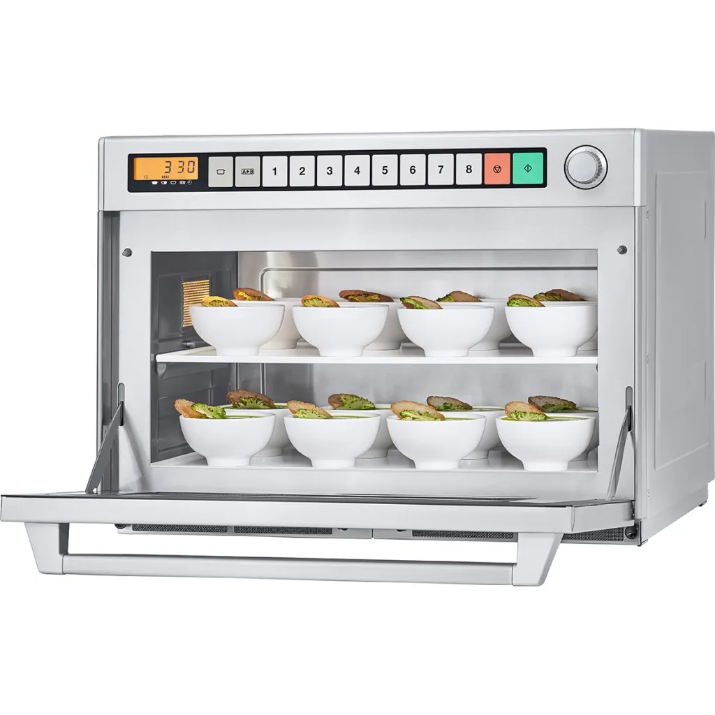 De PRO II magnetronovens zijn ontwikkeld voor drukke keukens waar in korte tijd grote hoeveelheden voedsel moeten worden verwerkt. Door het meegeleverd tussen plateau heeft u zelfs de mogelijkheid om op twee niveau’s te werken. De 4 magnetronbuizen ( twee boven en twee onder) zorgen voor een perfect resultaat bij koken, ontdooien of verwarmen. Door de grote naar beneden draaiende deur kunt u eenvoudig uw producten plaatsen en verwijderen en is de magnetron goed schoon te houden. Er zijn twee 220 V machines met een afgegeven vermogen van 1800 Watt en twee krachtstroom machines van 2100 en 3200 Watt afgegeven vermogen leverbaar.
